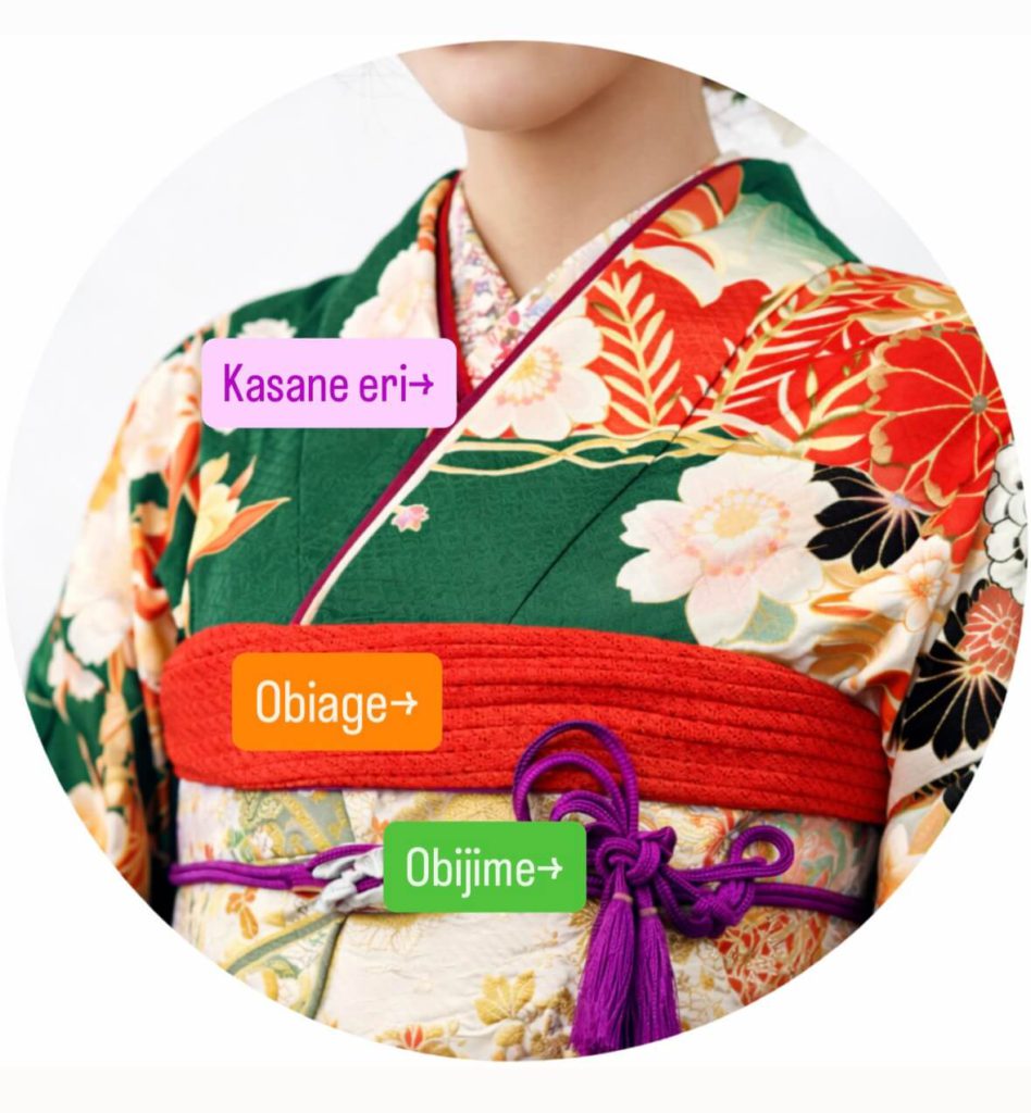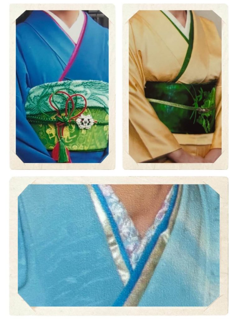 Besides kasane-eri, you can see two kinds of belts around the waists. The obiage (the sash for the  obi) and the obijime (the belts and accessories) **
