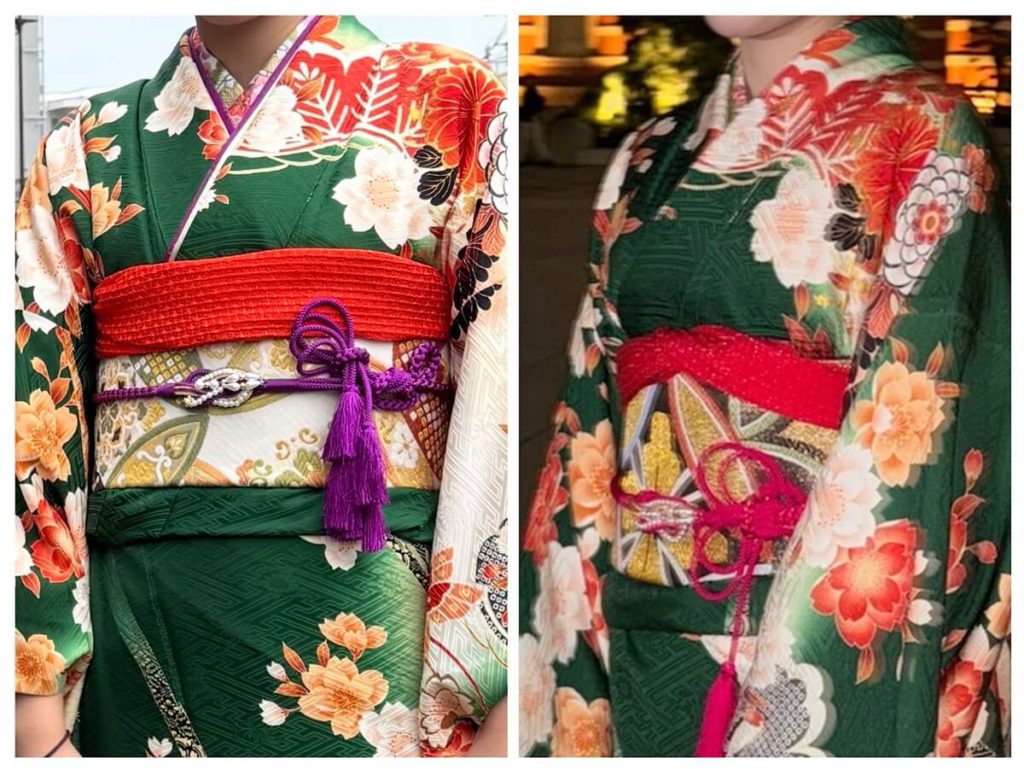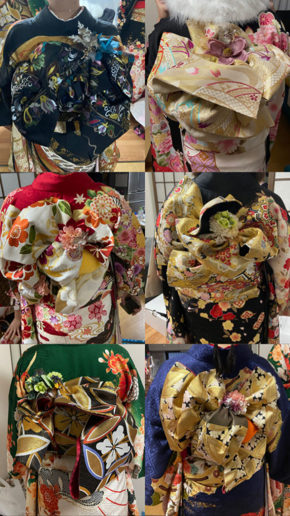 An obi is a long sash tied around the waist of kimonos, which are about 4-4.6m, 13-15ft. The length rolled around your waist varies from person to person depending on the figure. Kimono dressers shape the obi by using the rest of the length for decorative obi designs. I enjoy forming arranged obi knots and adjusting the wearer’s own personalities and height. There are three basic shapes of obi knots. Please look at the pictures below to see how I’ve arranged them. Do you recognize which ones are the same basic obi knots? It’s OK if you don’t get it. Precisely because you don’t get it, those will be one-of-a-kind and original obi knots.