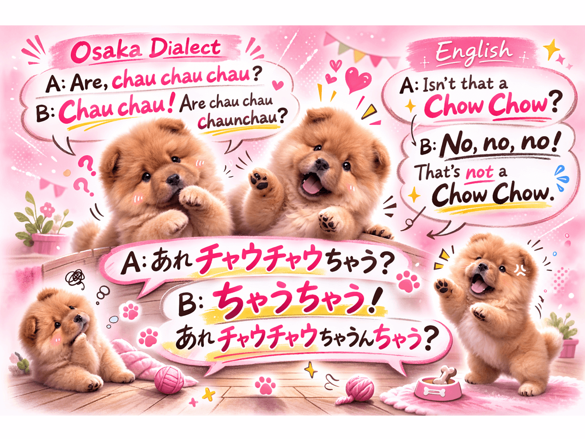 Have you ever heard someone from Osaka say “chau chau”? “Chau chau”??? It’s not a word you’ll find in Japanese textbooks. Translated into standard Japanese, “chau” corresponds to “chigau,” meaning “it’s wrong” in English. “Chau chau” repeats “chau” twice and is used when your conversation partner has said something incorrect, gently denying their opinion.